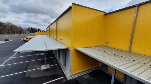 Damit die Pakete in einem Logistikzentrum der Deutschen Post trocken in Fahrzeuge verladen werden können, wurden Überdachungen im größeren Stil benötigt. Auf einer Fläche von 365m² wurden fast 19 Tonnen Stahl und Blech verbaut.