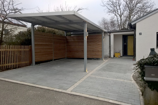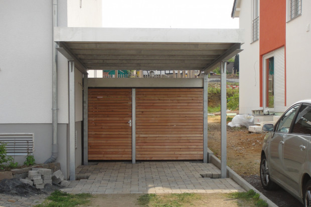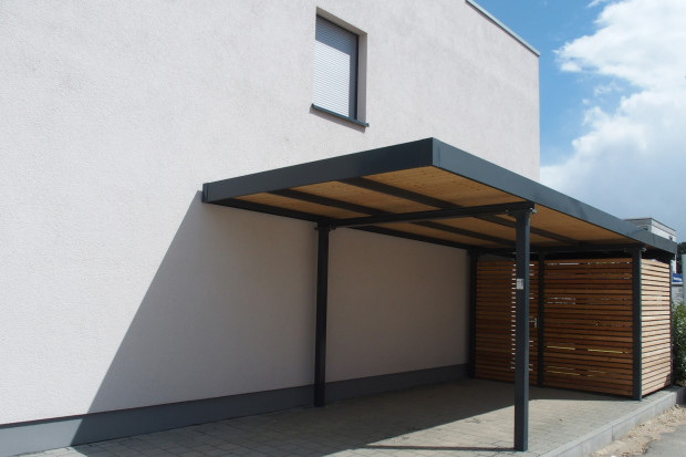 Pultdach-Carports eignen sich ideal, um eine Einhausung für Geräte, Mülltonnen oder Fahrräder zu integrieren. Im passenden Carport-Design.