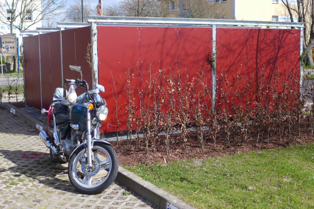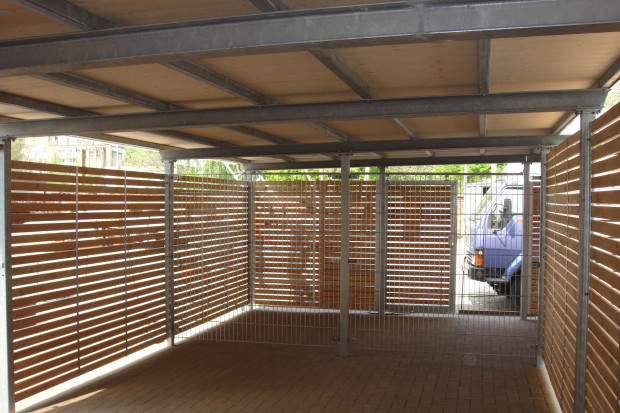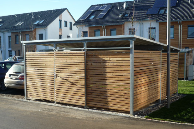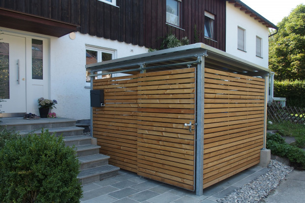 Über die Wahl der Außenverkleidung können Sie die Lüftungsverhalten steuern: Mit einer Lattung aus Lärchenholz wird die Geruchsbelastung im Mülltonnenhaus reduziert. Das ist praktisch, wenn Restmüll und Biotonne selten geleert werden. Gleichzeitig ist es innen heller. Für maximalen Sichtschutz empfehlen wir HPL-Platten. In Vandalismus gefährdeten Bereichen ist massives Stahlblech mit oder ohne Lochung erste Wahl. Für mehr Helligkeit im Inneren ist ein Dach aus Plexiglas® oder Glas eine interessante Option – auch ein Verzicht aufs Dach ist möglich, wenn es nur um reine Zugangskontrolle und ein schöneres Wohnumfeld geht. Wir haben auch schon Mülltonnenhäuser mit Gründach gebaut. Das entsiegelt Flächen und verbessert das Mikroklima.